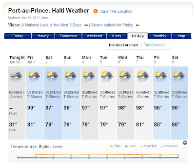 I'm not sure which I think is worse - the heat or the ongoing thunderstorms. As if there is a need for more rain right now after the recent flooding. And all those people still with inadequate shelter. Living in the mud for the next ten days (or more) is not going to be a good thing. The cholera epidemic has already gotten worse as a result of the recent flooding. I hope the "scattered" part of these thunderstorms means "very widely scattered."
